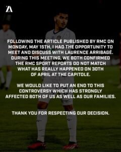 ونشر أبو خلال بيانا عبر حسابه الرسمي على “تويتر”، يكذب فيه المعلومات التي نشرتها شبكة “RMC sport” الفرنسية، موردا “بعد المقال الذي نشرته RMC يوم الإثنين 15 ماي، أتيحت لي الفرصة للالتقاء والمناقشة مع لورانس أريباجي، وخلال هذا الاجتماع، أكدنا أن تقارير RMC الرياضية لا تتطابق مع ما حدث بالفعل في 30 أبريل”.