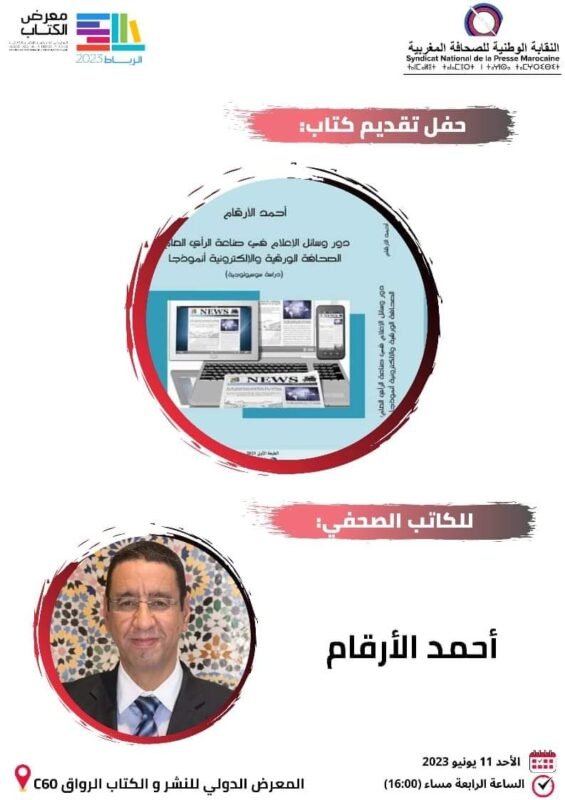 يوقع الزميل الصحافي والكاتب أحمد الأرقام، غدا (الأحد)، على الساعة الرابعة بعد الزوال، كتابه حول “دور وسائل الإعلام في صناعة الرأي العام. الصحافة الورقية والإلكترونية، دراسة سوسيولوجية”، برواق النقابة الوطنية للصحافة المغربية C60 بالمعرض الدولي للكتاب، الذي يختتم فعاليات دورته الحالية اليوم بالرباط.