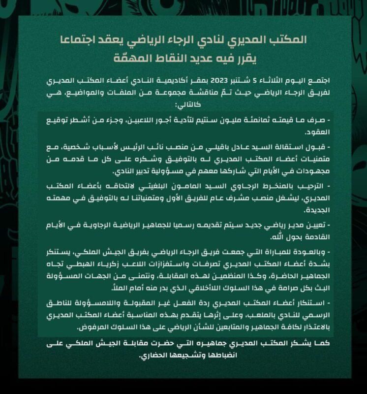 كشف المكتب المديري للرجاء الرياضي، عن خمسة قرارات مهمة، اتخذها خلال اجتماع له عقد أمس الثلاثاء 5 شتنبر 2023.