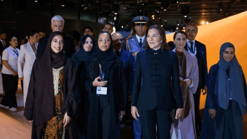 ولدى وصولها إلى المنطقة الخضراء “بيت الاستدامة” وجدت الأميرة للاحسناء في استقبالها وزير التربية الوطنية والتعليم الأولي والرياضة شكيب بنموسى، ووزير التربية والتعليم الاماراتي أحمد بالهول الفلاسي، ونائبة المديرة العامة للتعليم بمنظمة الأمم المتحدة للتربية والعلوم والثقافة (يونسكو) ستيفانيا جيانيني، ووزيرة الدولة الاماراتية لتنمية شؤون المجتمع، ورائدة الشباب للمناخ شما المزروعي.