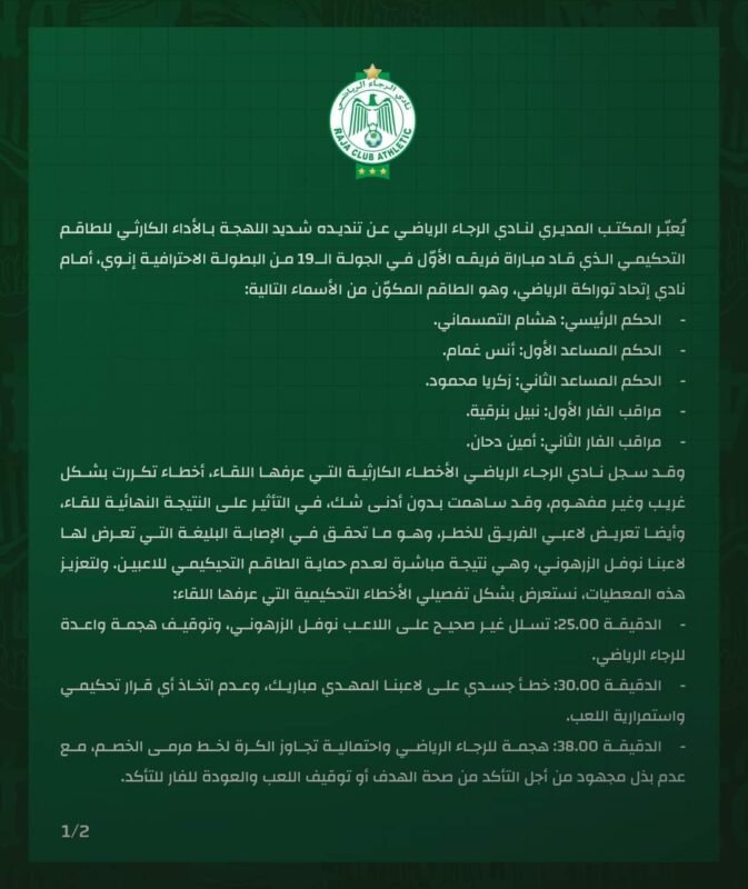 وعرض بلاغ الرجاء بالتفصيل، أخطاء الحكم هشام التمسماني، مضيفا أن أداءه “جسد صورة مسيئة عن التحكيم المغربي”، من خلال أخطاء “تكررت في كل مرة يدير فيها الحكم المذكور مباراة للرجاء، أو يكون في غرفة الفار”.