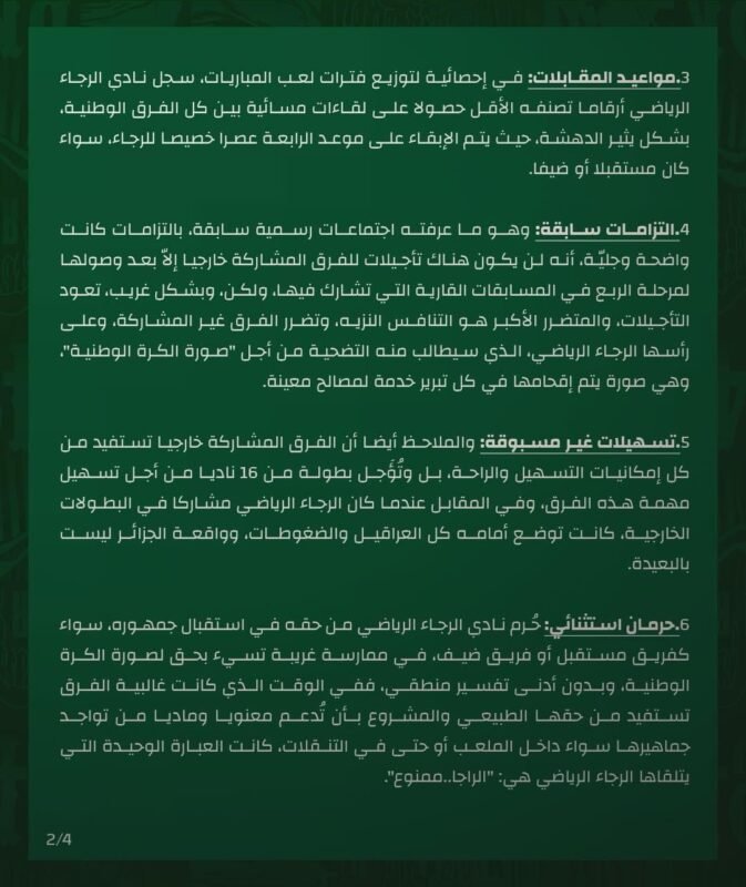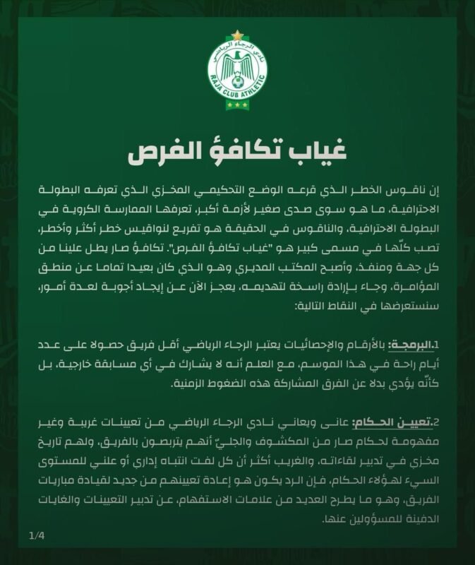وتضمن بلاغ الرجاء نقاطا عديدة، أراد من خلالها الفريق تبيان تجليات عدم تكافؤ الفرص في البطولة، محذرا من الإساءة لصورة كرة القدم الوطنية.