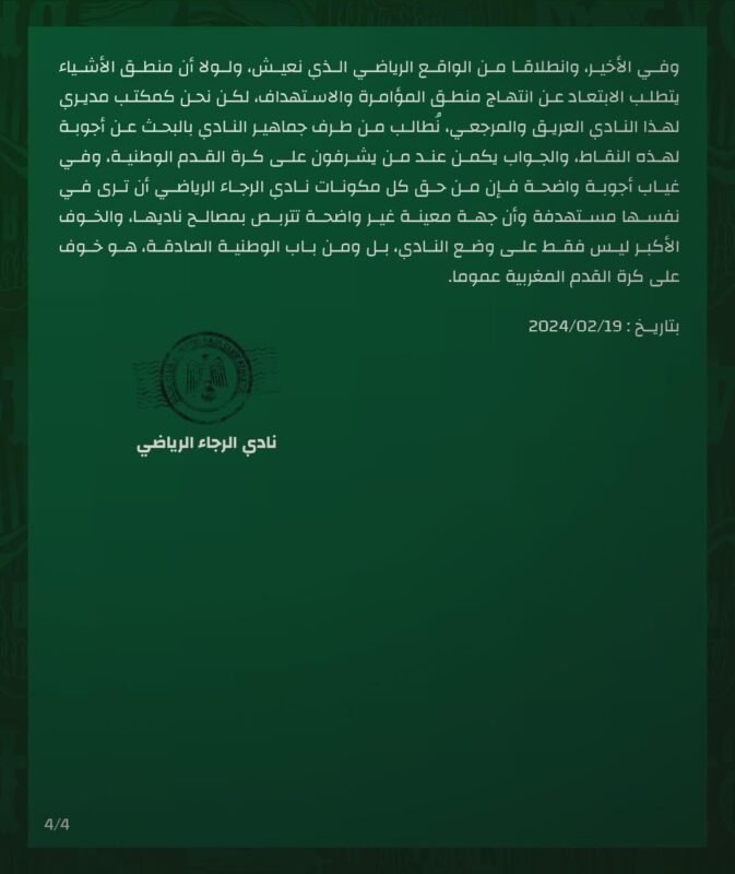 ودعا الرجاء في بلاغه شديد اللهجة، إلى تقديم أجوبة صريحة لكل هذه النقاط، من قبل من يسهرون على تدبير كرة القدم الوطنية.