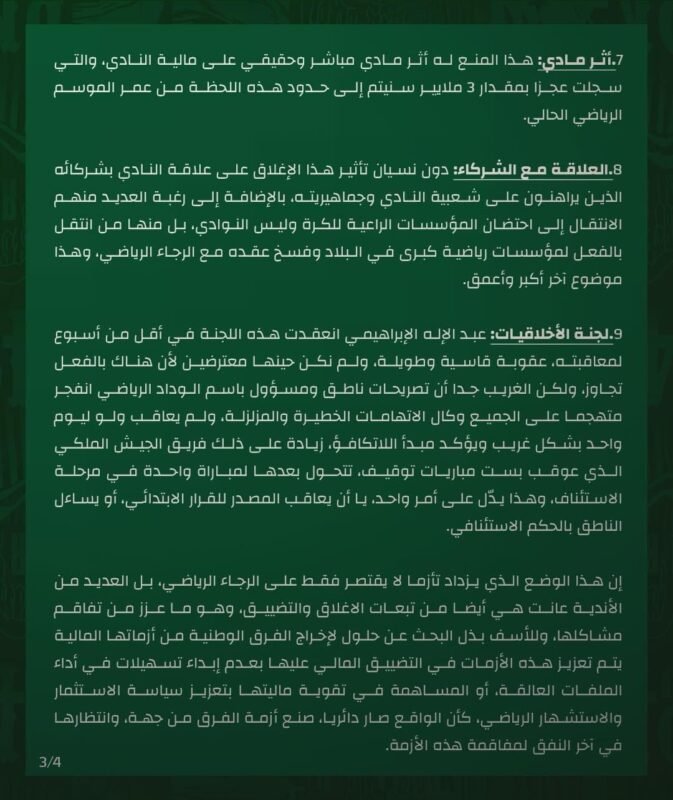 وتحدث البلاغ عن أزمة التحكيم، والبرمجة ولجنة الأخلاقيات، وكيف يتم معاقبة مسؤولي الرجاء في حين يتم تجاهل مسيري فرق أخرى.