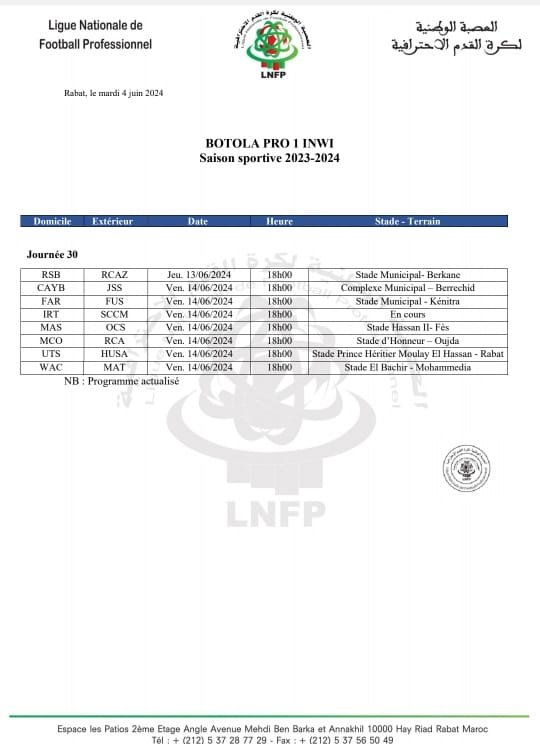 وحسب البرمجة الجديدة، فإن كل المباريات ستلعب الجمعة 14 يونيو، في السادسة مساء، باستثناء مباراة واحدة ستلعب الخميس 13 يونيو، ويتعلق الأمر بمباراة نهضة بركان ونهضة الزمامرة.