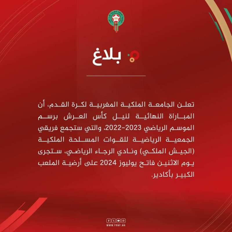 أصدرت الجامعة الملكية لكرة القدم، قبل قليل، بلاغا بخصوص نهاية كأس العرش، التي ستجمع بين الرجاء الرياضي والجيش الملكي.